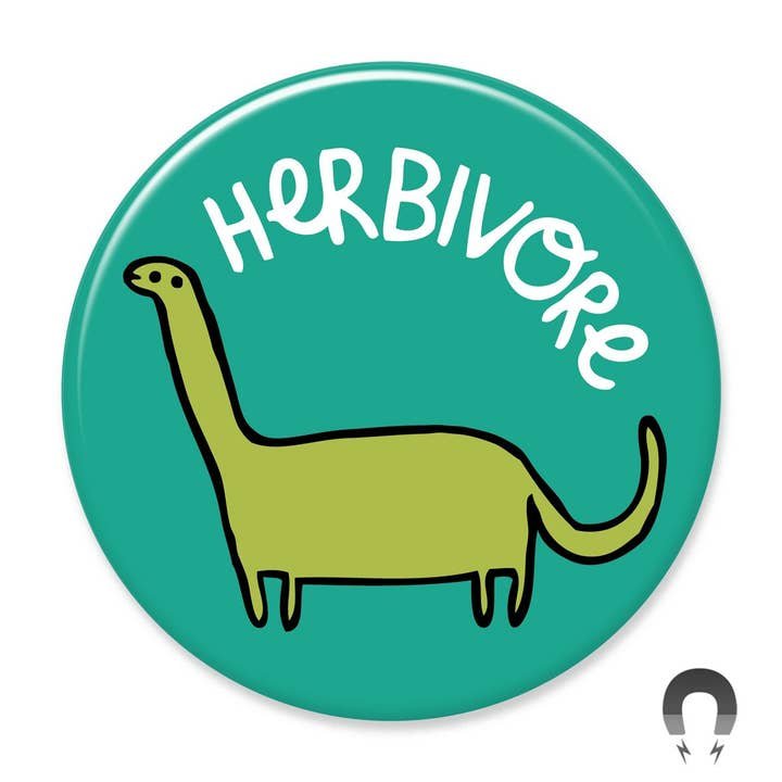 From Badge Bomb. the Herbivore Big Magnet is a stylish and eco-friendly accessory. Designed in collaboration with Gemma Correll. it brings a unique touch to your home or workspace. The magnet is hand-pressed from recycled materials.