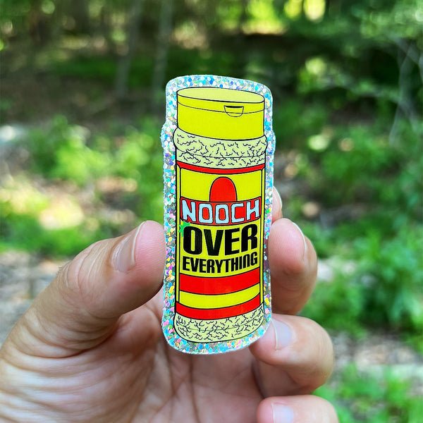 Nooch over everything. IYKYK. This 3 tall die cut sticker features a vinyl base with weather resistant coating. This combo creatures a high quality and incredibly durable sticker that stands up to harsh weather and won’t crack. peel. or fade. On a water bottle. it can go through a dishwasher and come out looking like new.